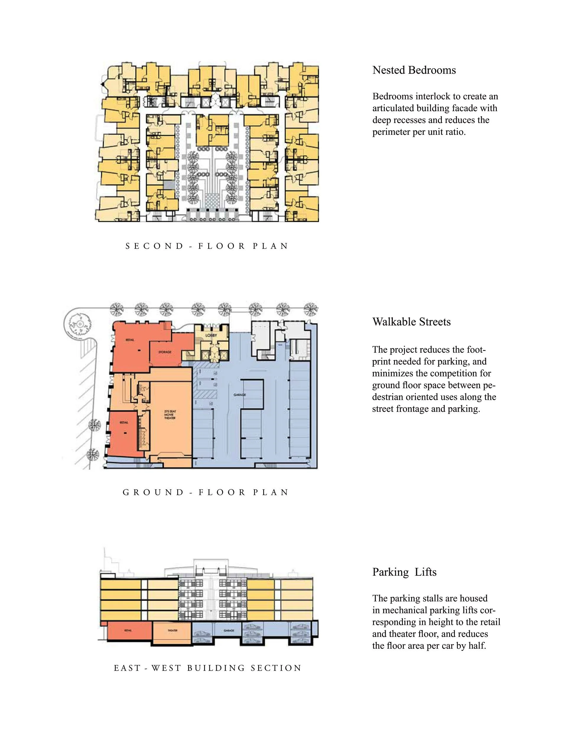The apartments are arranged around an upper level courtyard. Their compact plans with nested second bedrooms create an articulated street facade, embellished with clip-on sun shading elements.