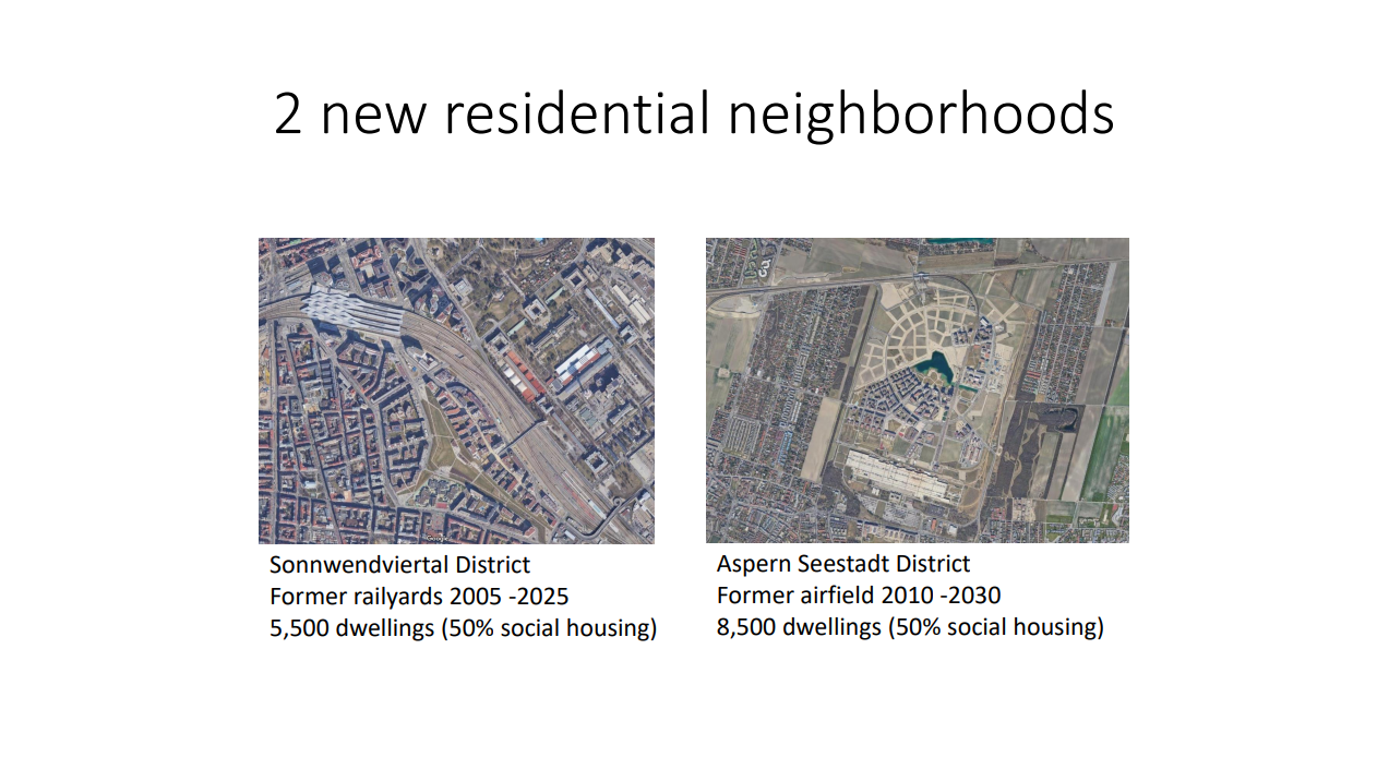 Since WW2 Vienna has continued to build social housing with developments such as the Alt Erla District by Harry Gluck. More recently Vienna has continued to build social housing projects as mixed-income developments with projects such as Kabelwerk, the transformation of a former industrial site; Sonnwendviertal on the site of the former rail yards next to the new Hauptbahnhof; and Aspern Seestadt on the outskirts of the city on the site of a former military airfield.