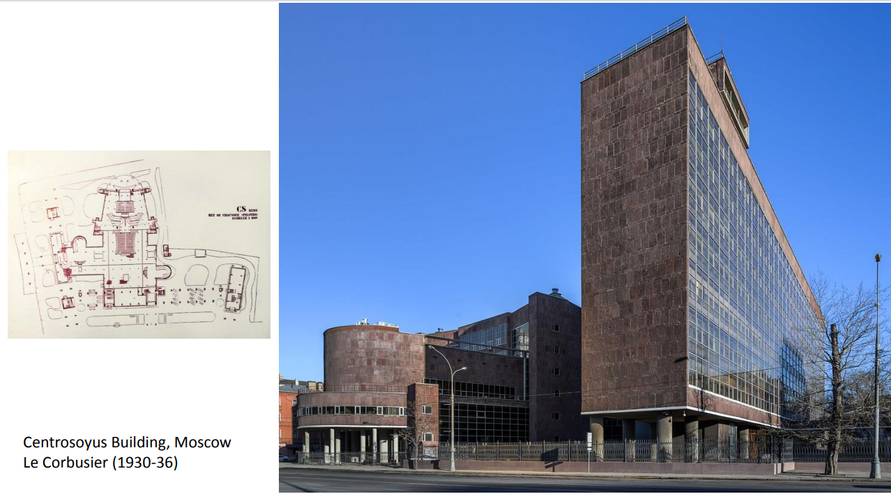 Ginsberg influenced Le Corbusier with his rooftop terrace. Corb must have seen this building when he visited Moscow when building his Centrosoyus Building.