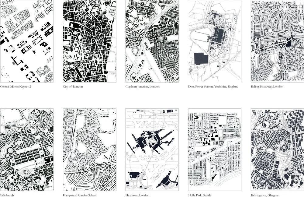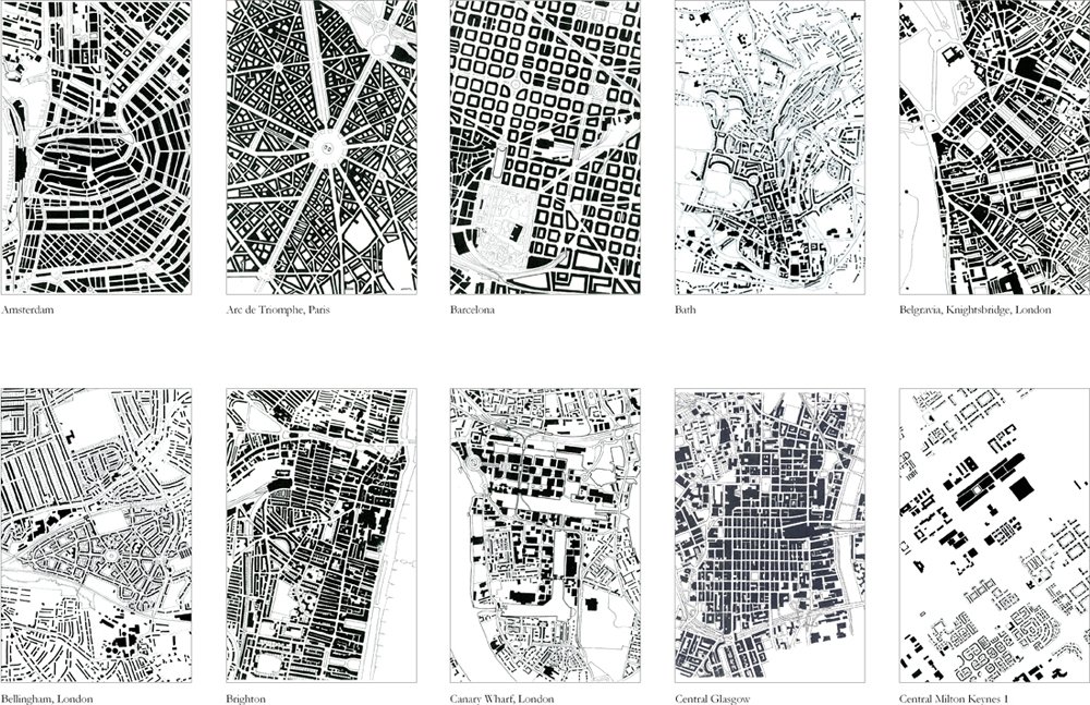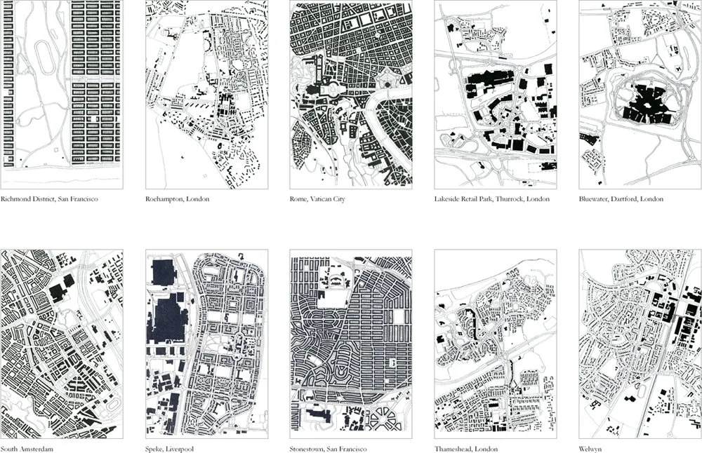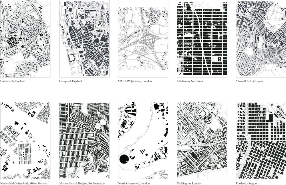 Figure Ground drawings are a valuable tool for understanding cities and any built environment. They reveal the interrelationship between buildings and the spaces around them. Figure ground plans can be read in a number of ways. The black shapes can be read as the continuous urban form of a traditional city, while the white shapes can be read as the figurative spaces carved out of the urban fabric. Strong urban fabric can be recognized in the different patterns of streets and blocks, and the shapes of the open spaces. Sprawl can be recognized in the fragmentation of isolated buildings, as objects floating in undifferentiated space.