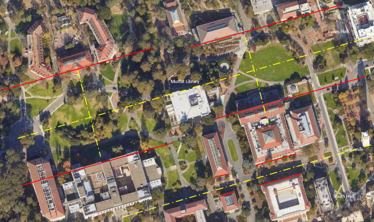 The blue circles mark the buildings Evans Hall and the Moffat Library that violated the Central Axis.
