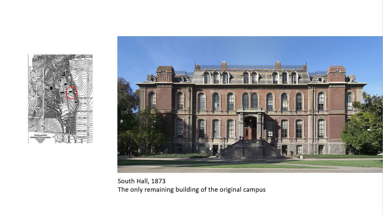 One of the first buildings on the campus, designed by Robert Farquharson in a French Second Empire Style. Its twin North Hall was replaced by Arthur Brown’s Bancroft Library. Both buildings established the axial relationship towards the Golden Gate.