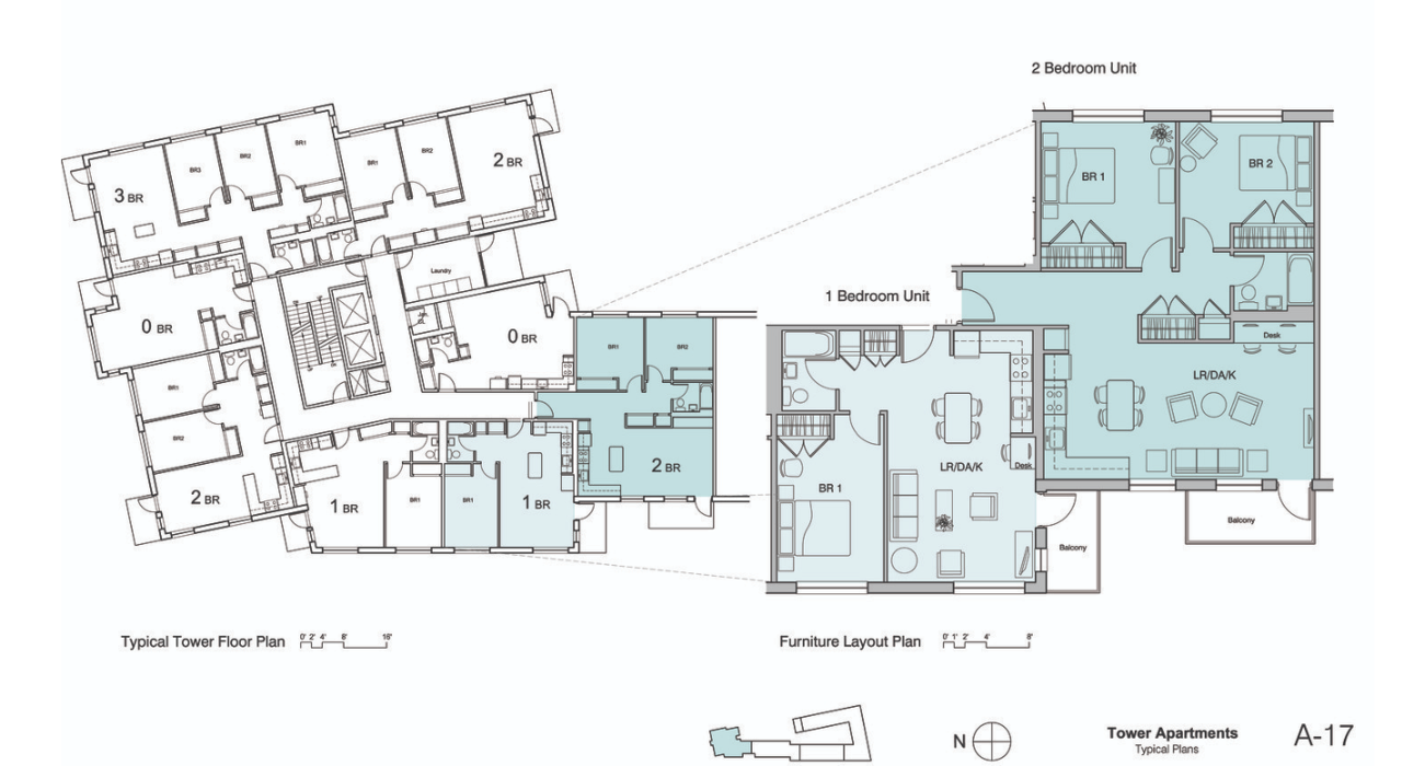 Typical floor plan showing the two elevator cores serving the high-rise and mid-rise portions of the building, and the walk-up low-rise units to the right.